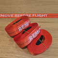 Ca. 4m lange und 25mm breite Spanngurte in rot mit "Remove before flight" Aufschrift.